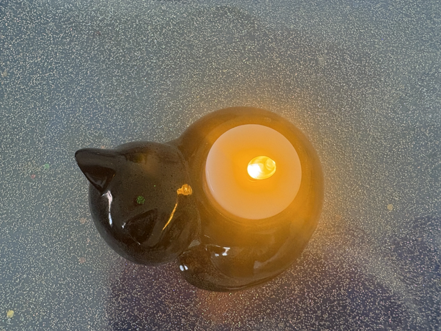 This is a black glittery resin cat. It holds a tea light in its back as shown in the photos. This is a very sweet little cat.
