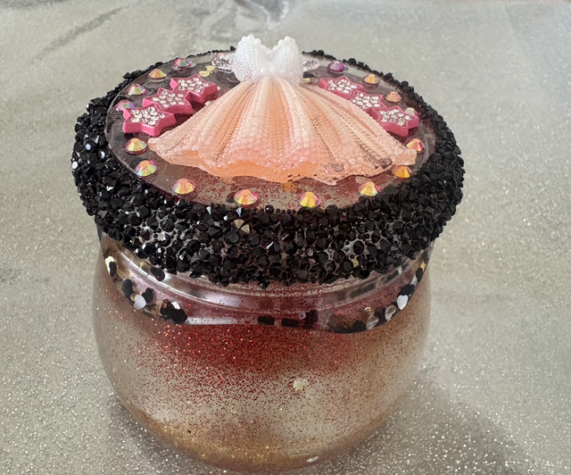 This is a gorgeous screw top jar with a beautiful peachy/ pink dress on the top with pink triple stars and diamantés. There is also a black diamanté trim around the lid. Within the resin there is red and gold glitter and black and gold hearts.