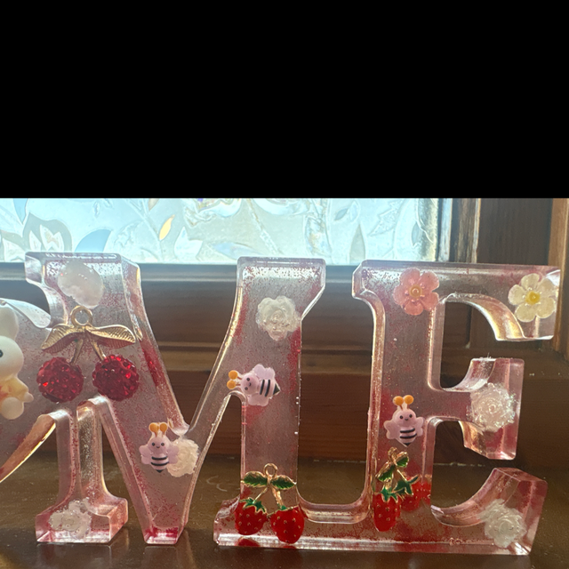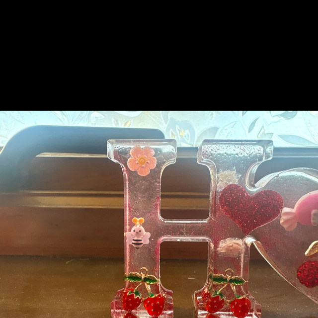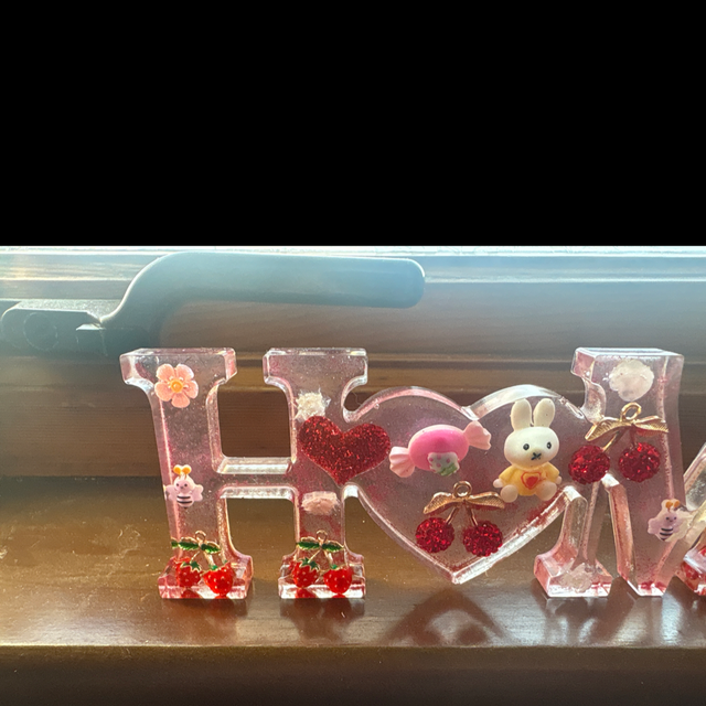 This is a very cute HOME sign. I have put a cute bunny, a sweet and bling cherries in the heart. In the other letters there are bling cherries, strawberries, a heart and flowers.