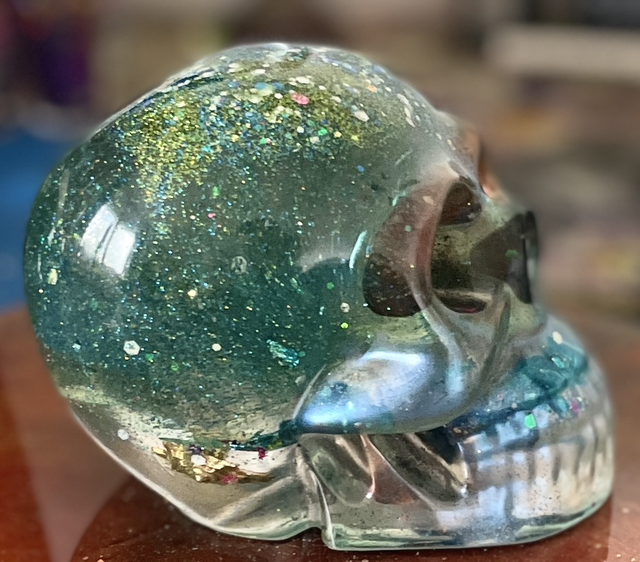 This is a handmade, large blue/green/turquoise glittery skull with spinners added into the bottom of it, which are gold, silver and blue. You can see these thorugh the side of the skull and through the bottom.