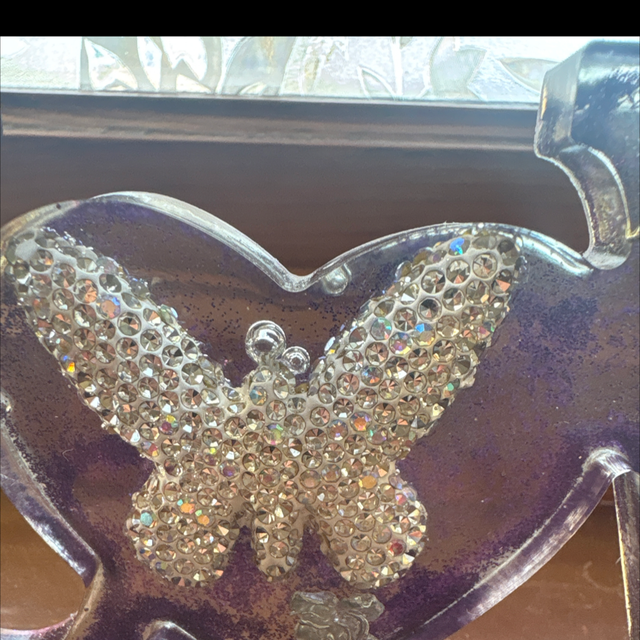 This is a lovely love sign. I have put a lovely bling butterfly in the heart and used butterfly charms and roses within it. This is a lovely piece. It is reduced due to the bubble at the top of the butterfly, however it is still beautiful.