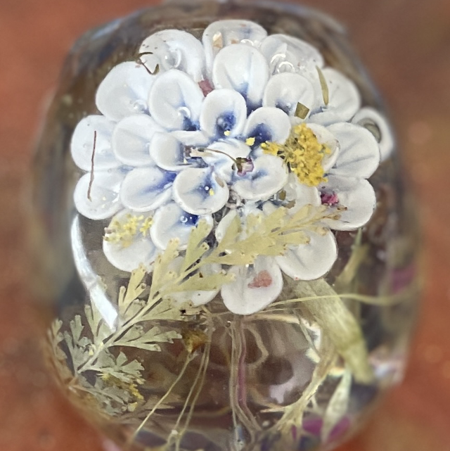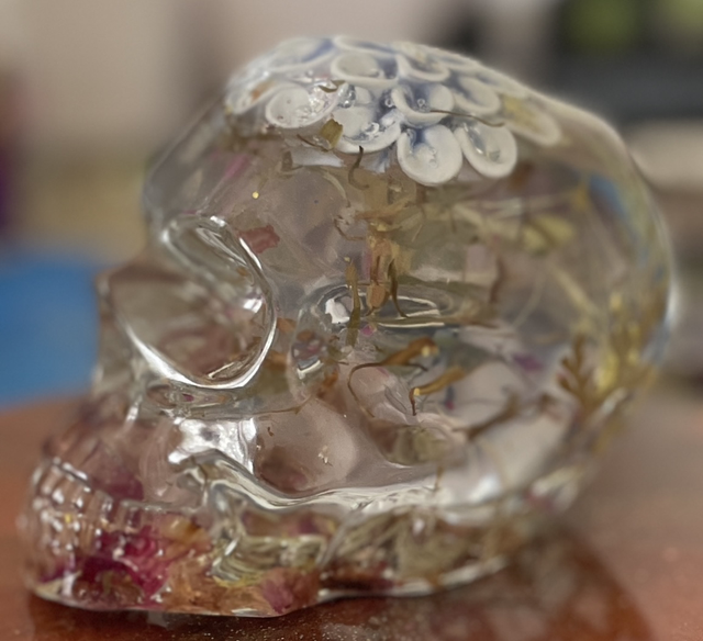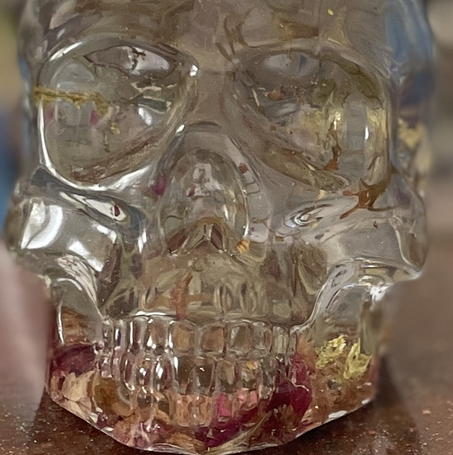 I have placed a blue porcelain flower into the top of the skull. Within the skull are real dried flowers and leaves, finishing with real dried rose petals in the bottom. The bottom of the skull is bumpy due to this.