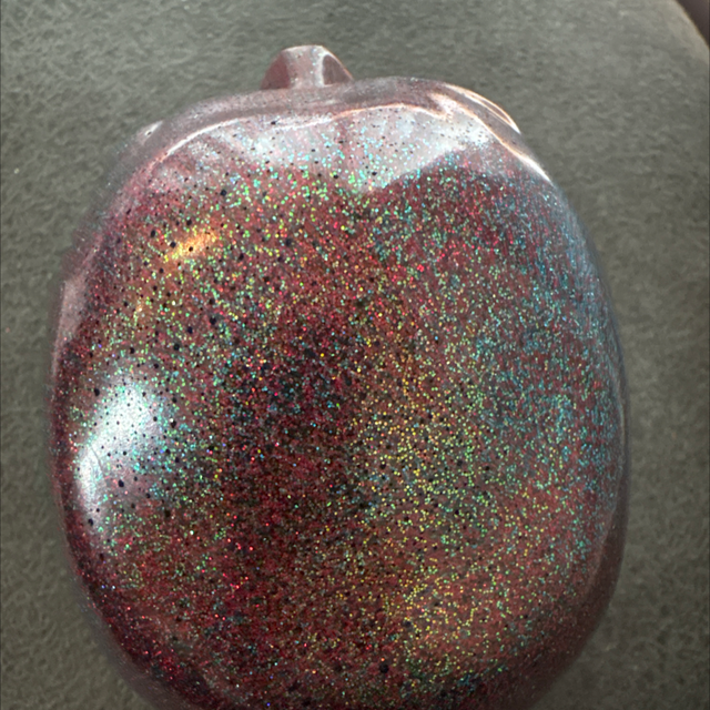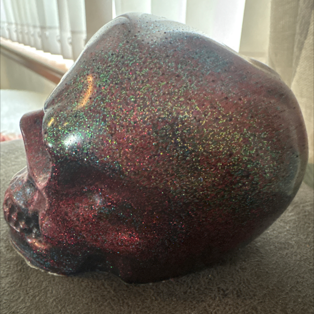 This is a multi coloured glittery medium skull which is very pretty. I used different colours of fine glitter and poured in black resin. The red, blues and greens really show through. It shimmers in the light. The base is black with some glitter on it.
