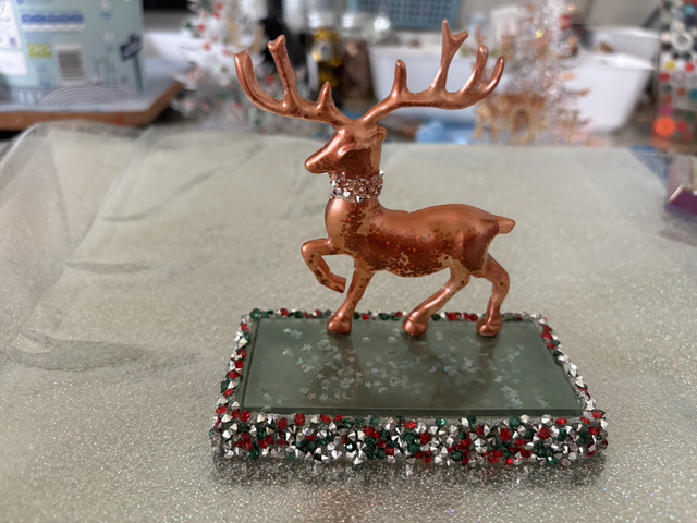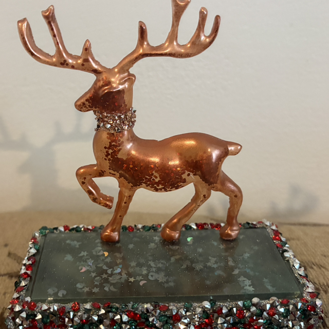 2 is a bling bronze reindeer with a green base. green/red and silver crystals are on the edge of the base and on the neck.
