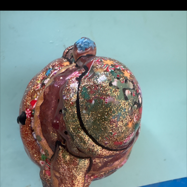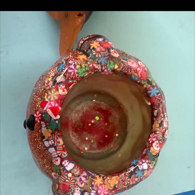 This is a lovely glittery snowman pot. I have added in fimo slices including snowflakes, snowmen, penguins, candy canes, gingerbread men and candies. These are at the top of the jar and the hat has them in the top and a blue snowflake in the bobble.